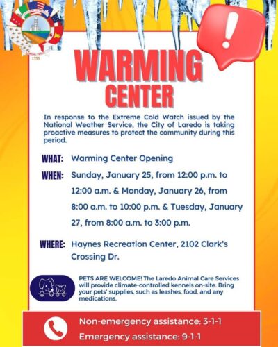 Además, todas las instalaciones de la Ciudad de Laredo permanecerán abiertas en su horario regular de operaciones el lunes y martes y podrán utilizarse como espacios cálidos y seguros durante su horario de servicio.