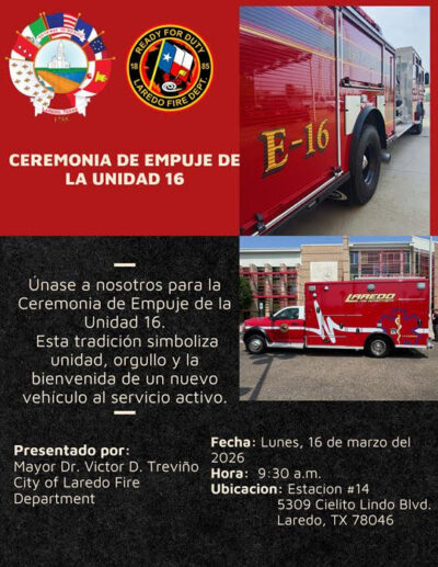 Laredo, Tx.- El Departamento de Bomberos de Laredo anunció la activación oficial de la apagadora Engine 16 y una nueva ambulancia, dos unidades de respuesta de primera línea que reforzarán la capacidad del departamento para atender emergencias y proteger a los residentes de la ciudad, en el área de Cielito Lindo, al sur de la ciudad.