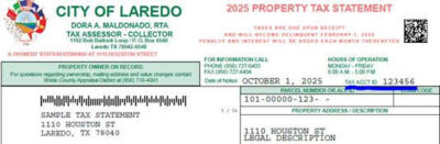 Para utilizar el sistema, los contribuyentes deben tener a la mano su número “Tax ACCT ID.” Este es el identificador único de la Ciudad de Laredo para cada cuenta de impuestos a la propiedad y se encuentra en la esquina superior derecha de la declaración de impuestos del mes de octubre, junto a la “Fecha de Notificación.” El número “Tax ACCT ID” consta de 4 a 6 dígitos: